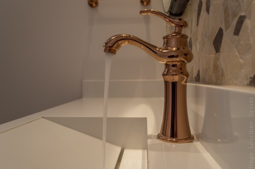 Para quem ainda não conhece, os arejadores dão o aspecto esbranquiçado à água devido à mistura de ar, como é possível conferir na foto acima do misturador St Claire, da Bracci, instalado no projeto da Studio Elevare. A título de comparação, uma torneira sem o dispositivo, como pode ser vista na foto abaixo, tem um fluxo de água mais denso.