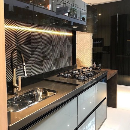 Como na foto abaixo, a cozinha minimalista em tons escuros ganhou um ar mais sofisticado com as figuras geométricas na parede. Note ainda que as gavetas inferiores têm linhas retas, puxadores invisíveis e, acima de tudo, muito requinte.