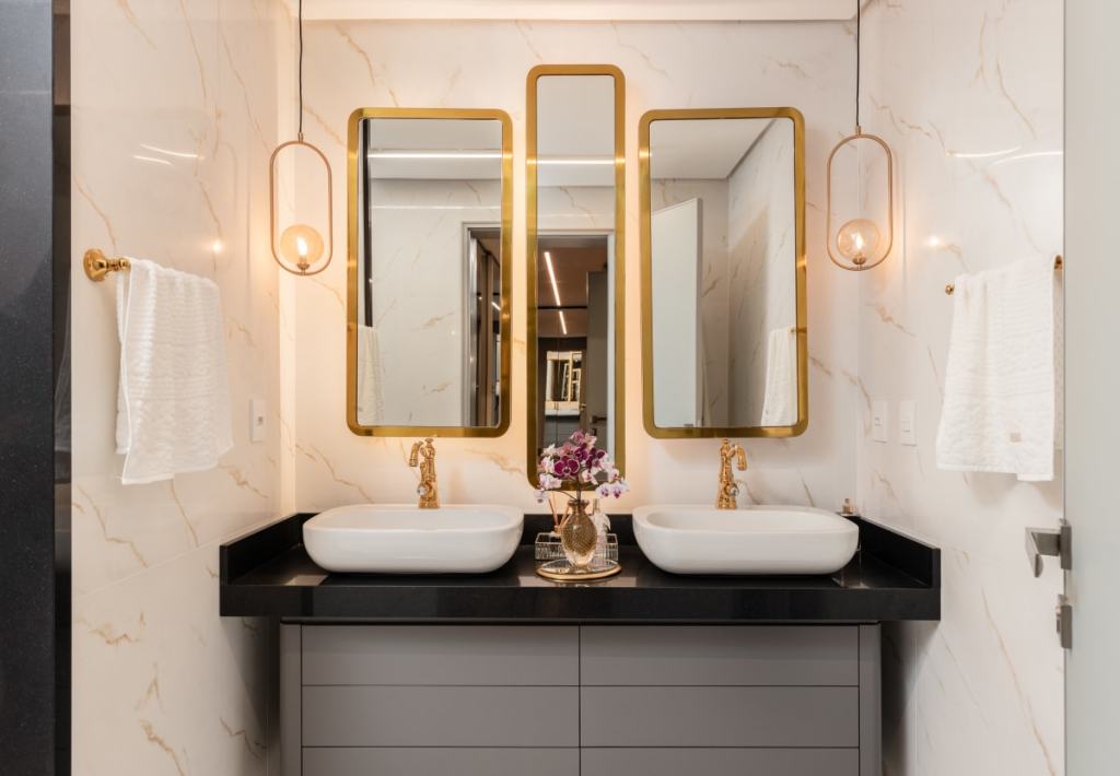 O dourado permite elevar qualquer item de decoração dentro do ambiente. Na decoração do banheiro o dourado é frequentemente utilizado nas ferragens do box, nas torneiras, chuveiros e acessórios também.