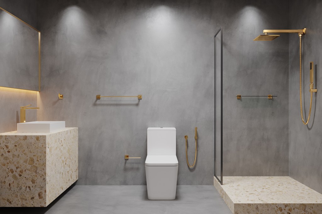 Banheiros modernos utilizam formas retas, cores neutras, poucos elementos somente decorativos e são totalmente funcionais. Além disso, eles possuem uma decoração minimalista, o que confere fluidez ao ambiente. Metais dourados, como monocomandos e chuveiros, podem ajudar a criar um ambiente moderno.