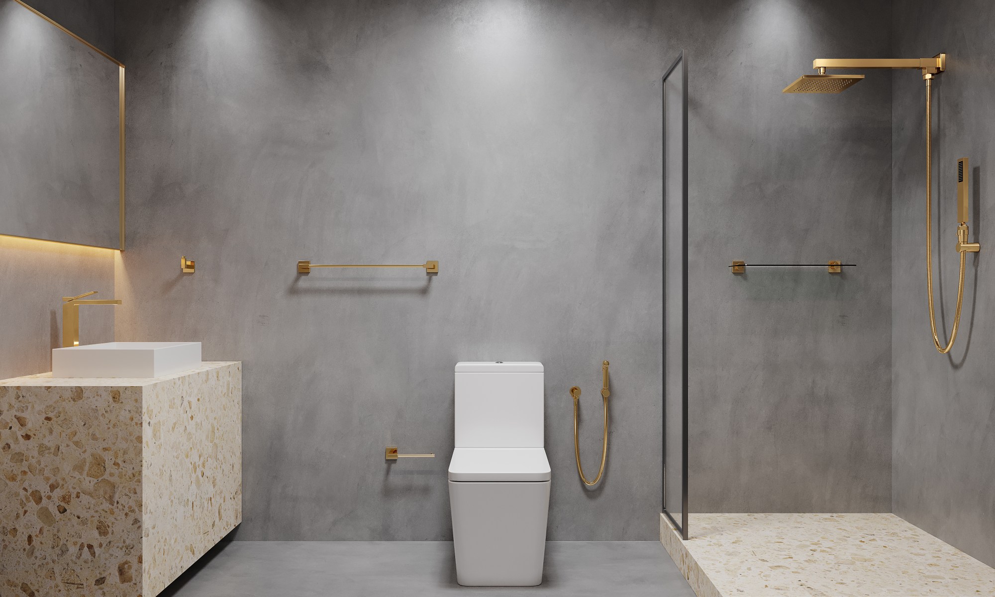 Banheiros modernos utilizam formas retas, cores neutras, poucos elementos somente decorativos e são totalmente funcionais. Além disso, eles possuem uma decoração minimalista, o que confere fluidez ao ambiente. Metais dourados, como monocomandos e chuveiros, podem ajudar a criar um ambiente moderno.