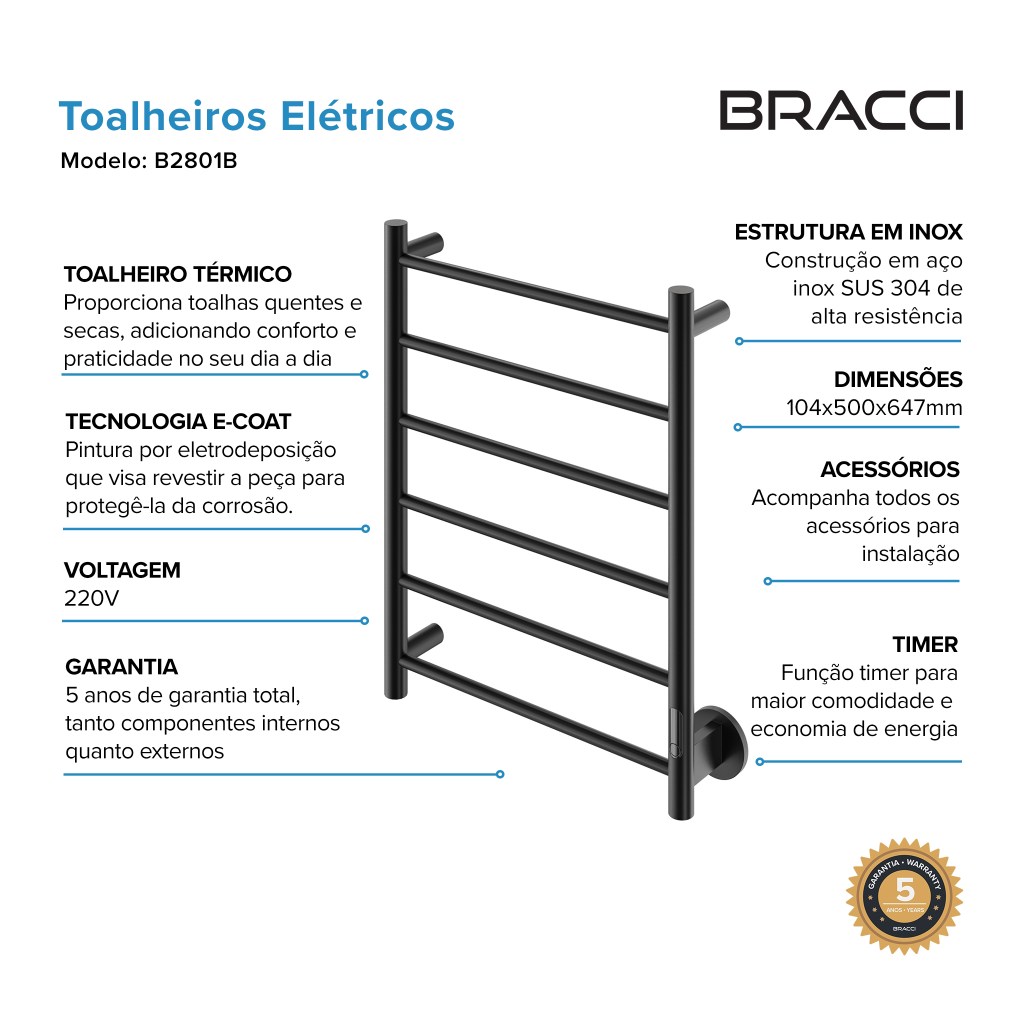Os toalheiros elétricos são suportes para toalha com um sistema elétrico embutido. A média de temperatura pode variar entre 35°C e 45ºC, não oferecendo qualquer tipo de risco ao ambiente e à saúde, afinal, ele não esquenta a ponto de queimar as toalhas ou gerar queimaduras na pele.