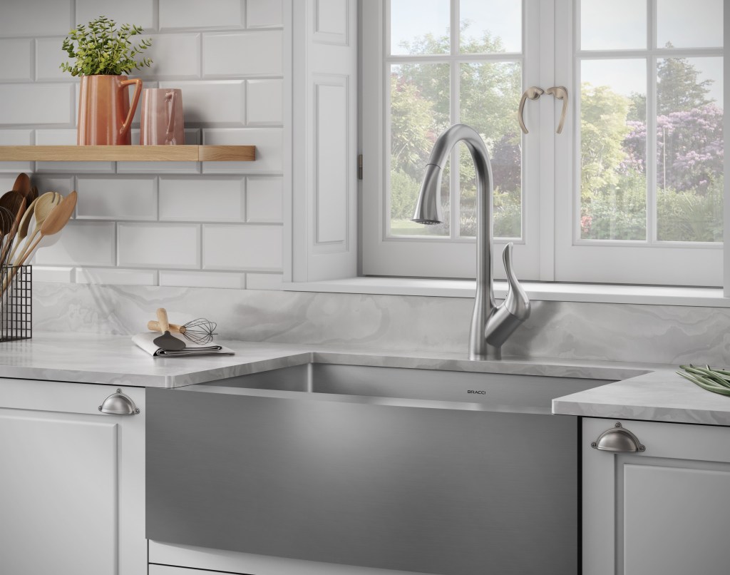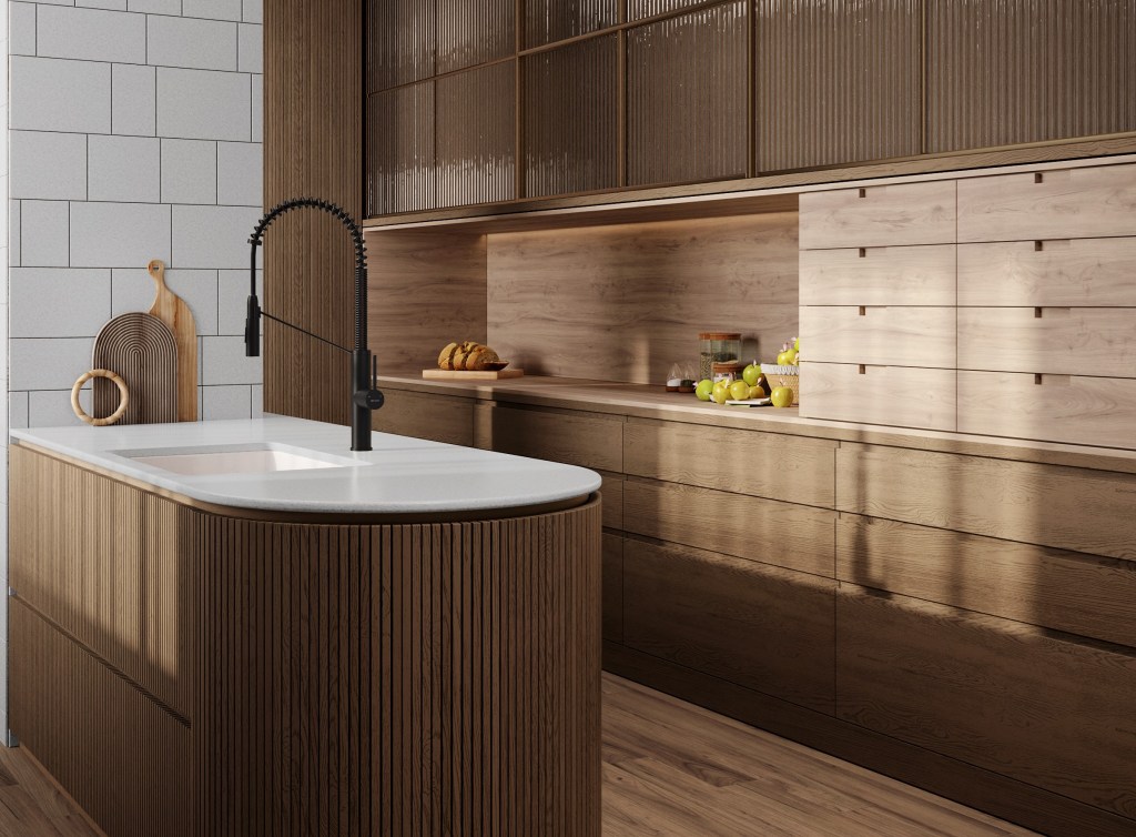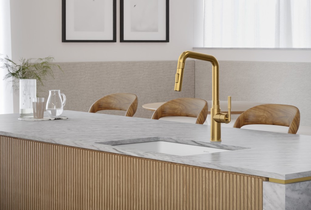 Na escolha dos metais também é importante estar atento ao conceito de simplicidade e funcionalidade. Cubas de cozinha espaçosas em aço inox garantem a beleza e a praticidade da bancada. O Monocomando Allure é uma ótima opção para quem busca inserir o minimalismo na sua cozinha, com detalhes recartilhados e um sistema prático ele é a peça ideal para um ambiente agradável aos olhos.