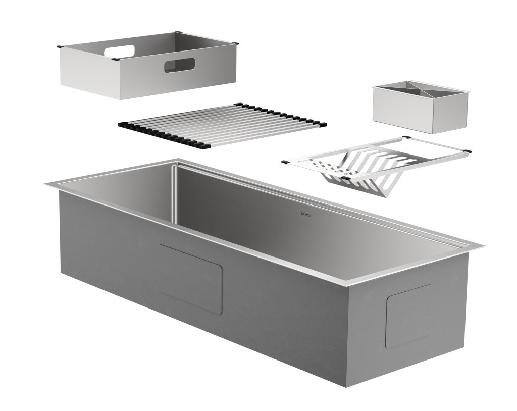 A Cuba Workstation Bracci não é apenas uma pia, mas uma verdadeira estação de trabalho na cozinha. Ela oferece três funções em uma só peça: pode ser utilizada como cuba tradicional, bancada de preparo de alimentos e área de escorredor, tudo isso graças aos seus acessórios acopláveis, como saladeira, escorredor, esteira multiuso e grade interna. Isso transforma a estação em um verdadeiro centro de atividades.