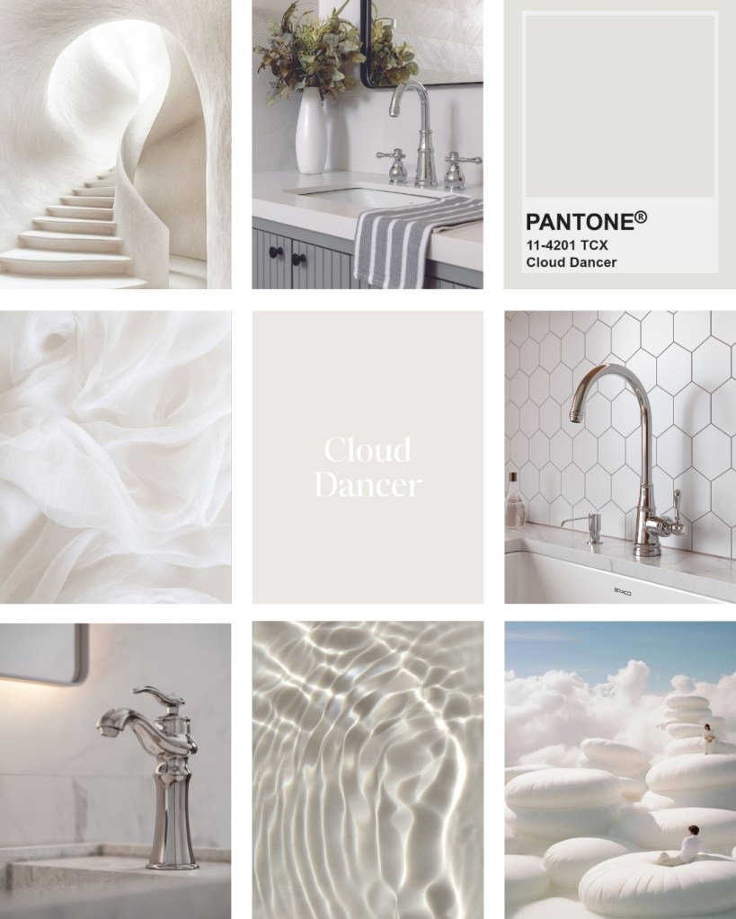 Cloud Dancer reflete a luz de forma suave, sem criar contrastes agressivos. É por isso que ela funciona tão bem em espaços de banho, onde a iluminação natural ou indireta pode criar uma experiência sensorial mais acolhedora.