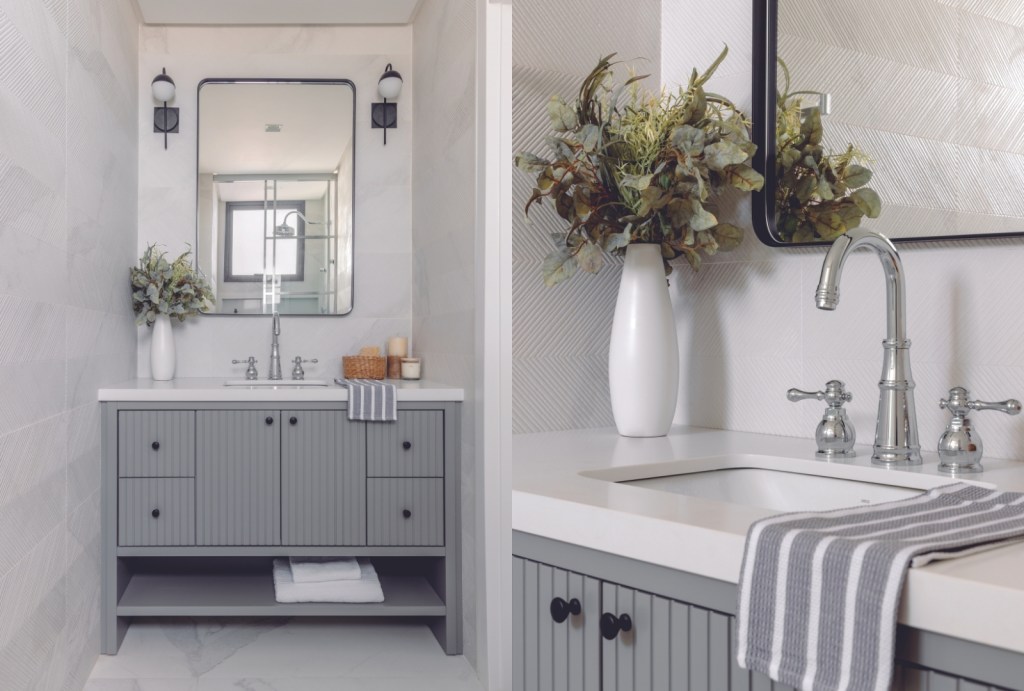 É uma paleta que reforça a naturalidade, contato com elementos orgânicos e uma estética calm design, perfeita para áreas de banho com foco em bem-estar. O aço escovado reforça uma sofisticação discreta, perfeita para banheiros onde a intenção é transmitir conforto, calma e naturalidade, sem abrir mão da elegância.